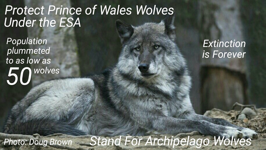 Please protect the Alexander Archipelago Wolves on Prince of Wales islands under the Endangered Species Act. Scientists and conservationists assert that the Archipelago wolf population has plummeted to a dangerously low population, and that distributions are no longer sufficient to maintain genetic viability. More importantly, existing regulations (which have not been adhered to) with the failing taxpayer supported logging projects on Prince of Wales are not adequate enough protection to ensure persistence of population numbers of this unique species.