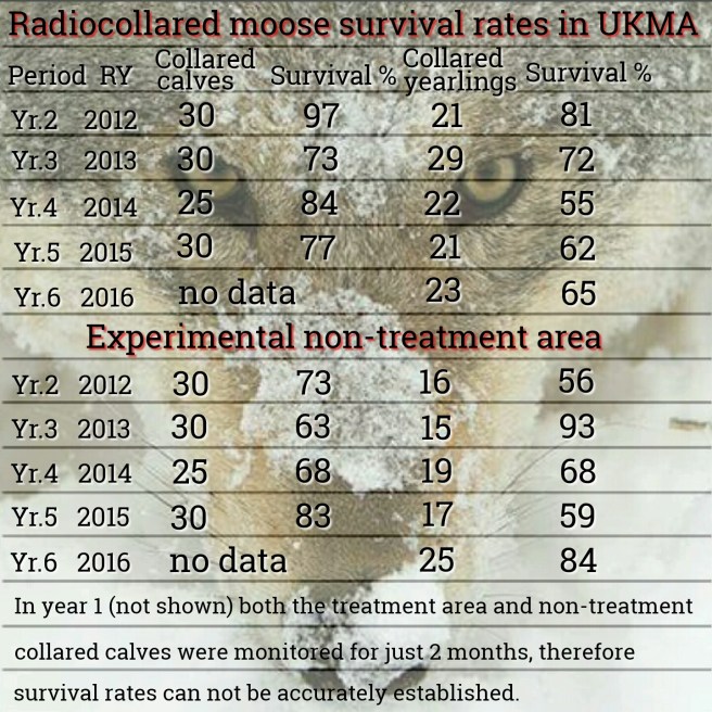 The calculated yearly harvest (human) of moose prior to the slaughter of these magnificent animals was 16. The last calculation offered by the department was in year 4 (RY 2014) when just 14 moose were harvested. Even worse was year 3, the first year after the wolf control began, when only 10 moose were harvested. No data was offered for 2015 or 2016.