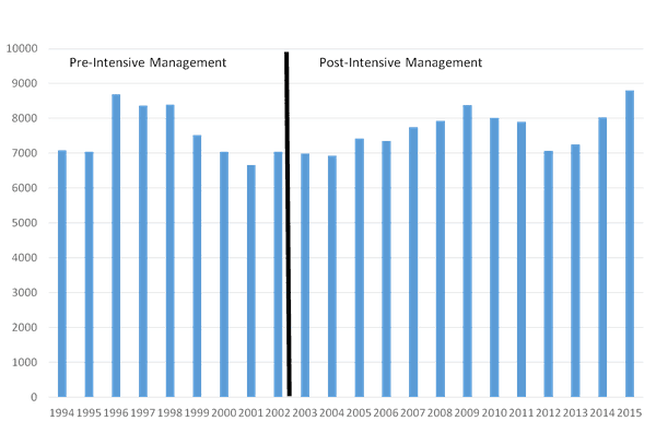 The graph below shows moose harvest for each year during the period starting when the intensive management law passed in 1994 and extending to 2015.