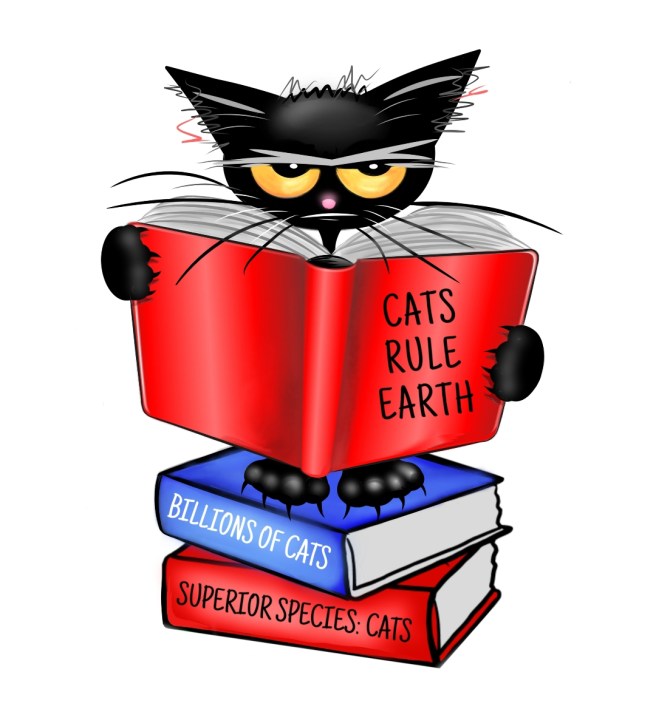 Cats Rule, by Stephen Edwards, is available in a variety of tees, sweatshirts and hoodies in a variety of colors, and with some great matching gear! 66 products in all! Detail of illustration below. Our cat sits atop anywhere from zero to nine books depending on the product.