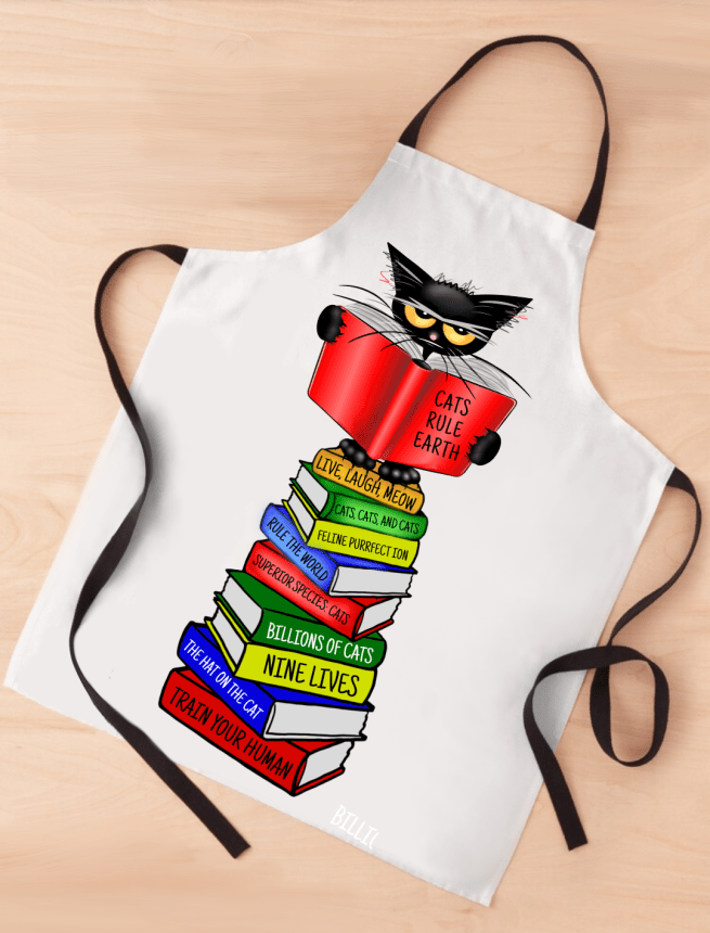 On aprons, note pads and floor pillows our cat sits upon nine books!