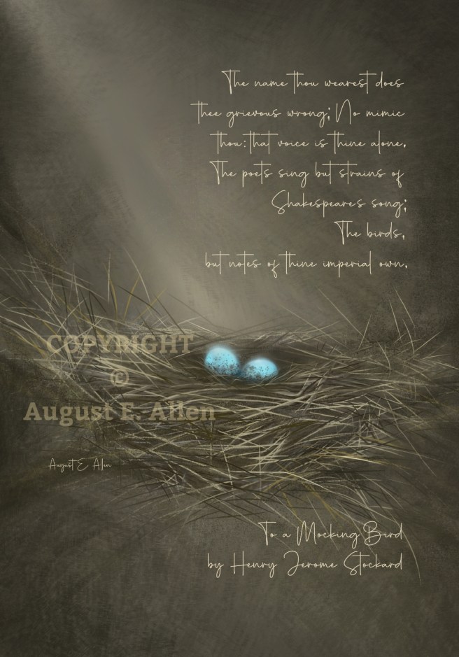 To Love a Mockingbird Available in wall art only. Art boards and notepads are also offered but with a poem by Henry Jerome Stockard called To a Mocking-Bird: