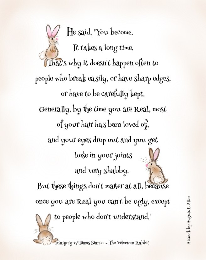 You become. A lovely quote from the Velveteen Rabbit, by Margery Williams. Available in wall art and notepads only. Tap on image or title to purchase. To protect the copyright image shown here is in low resolution. Read The Velveteen Rabbit (as it was originally printed), with original artwork, here.