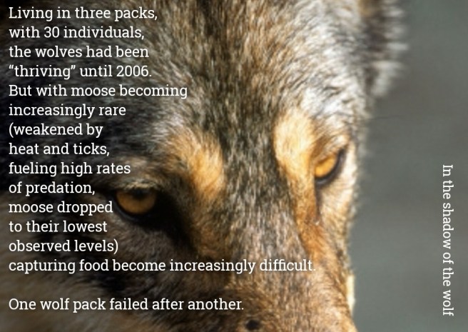 Before I begin, I would like to point out that there are approximately 1,600 moose inhabiting Isle Royale presently (the highest count was 2,500 individuals in 1966). Climate warming is affecting this iconic cold adapted species (the moose are physically shrinking and living shorter lives), as is an astounding number of ticks at one time. Thanks to global warming, one animal which typically can get 30,000 ticks in normal fall weather conditions, now contends with as many as 160,000 ticks during warmer winters and in years with a late first snowfall. The eventual result for heavily tick infested moose is malnutrition and death; a high number of ticks is “almost a death sentence” for calves because they can lose their entire blood supply over just a few months. Climate change magnifies the tick problem because the pests live longer and reproduce in greater numbers if there’s less snow on the ground by spring. Add 30 wolves to the scenario (predating on approximately 10 moose each, yearly), factor in death from illness or disease, or *severe weather, I hardly imagine that this prime food source for the wolves will survive for longer than 4 or 5 years. However, my aim is to focus on the wolves alone with this post; the moose and ecosystem of the island will not be discussed further here. More information on this topic can be found here.