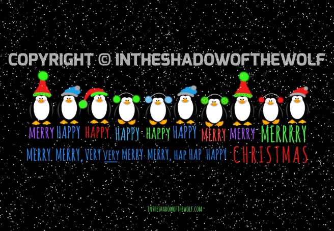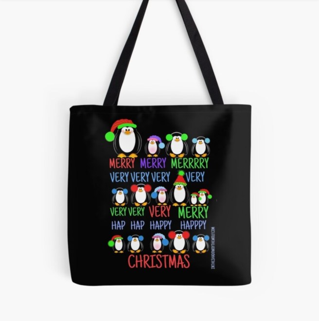 We offer 2 different designs with the penguins thinly outlined in light gray on apparel, aprons, and all over print totes. Very, very merry, hap hap happy Christmas is also available on kids and baby clothing, 58 products all together.