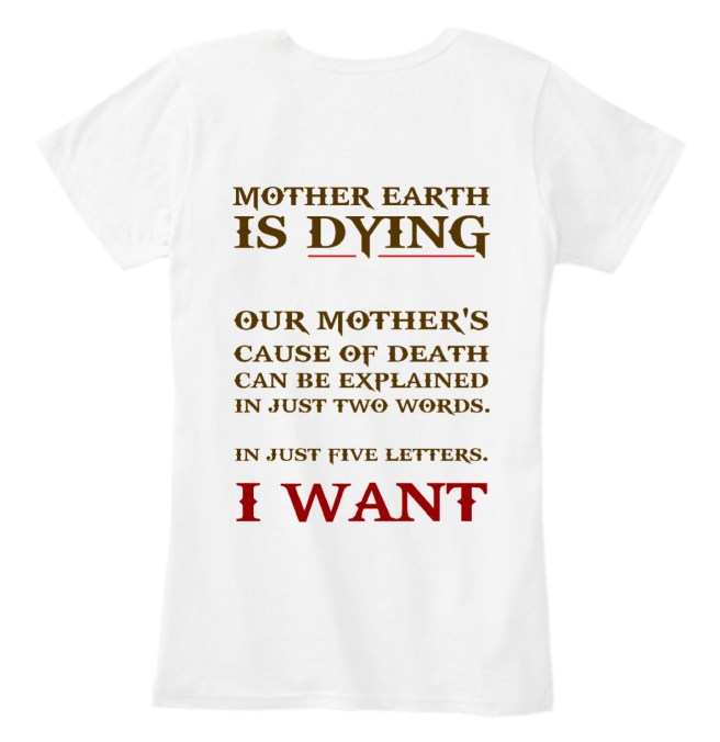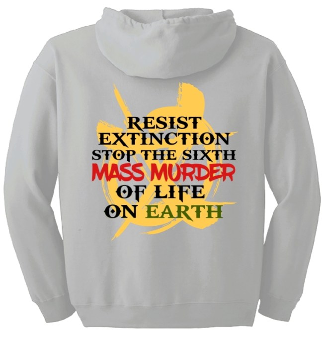 Resist Extinction is available in a wide variety of colors and styles, printable on front or back, in tees and sweatshirts. Resist Extinction is also available in accessories and home decor, 44 different products in all. Note that this item is recommended printed on lighter clothing as lettering is dark, and without a lighter shadow. Shown below: