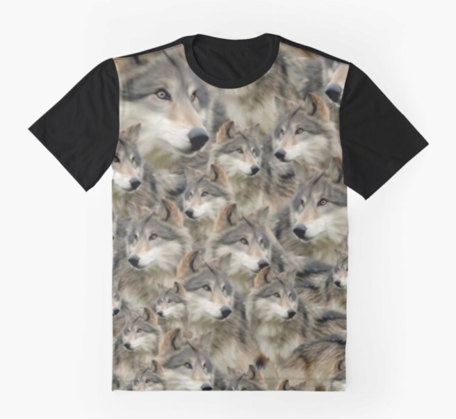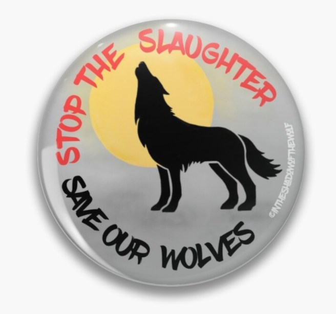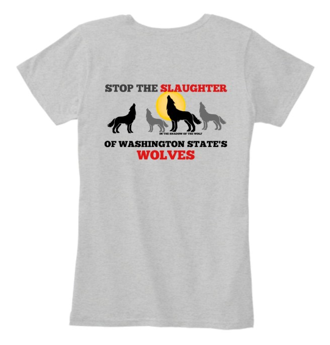 Save WA Wolves available in a wide variety of tees, printed on either the front or the back of any shirt. We also have a matching pin button as shown below. 100% profits from this item are donated directly to the Center for Biological Diversity, and their ongoing efforts to protect wolves from being killed at the behest of ranchers grazing livestock on public lands in national forests in Washington state.