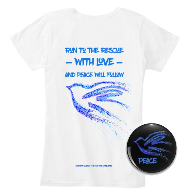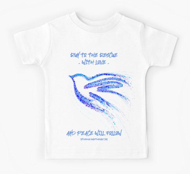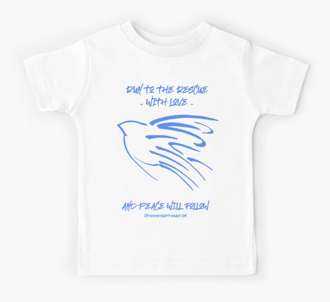 Our 2nd version of Run to the rescue with love and peace will follow, with a slightly different tone and font, available in sublimation tees and tanks, is also available in button pins: