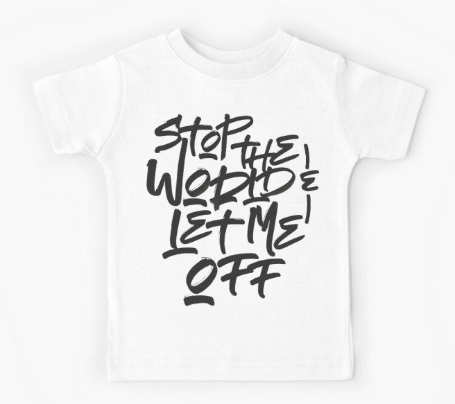 Stop the World! Available in a wide variety of tees and hoodies, as well as home decor and accessories! 53 items in total.