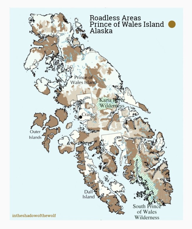 Over 300,000 acres have already been logged on Prince of Wales and adjacent Islands The deer are strongly influenced by the loss and fragmentation of old-growth forest habitat. Add to this already desperate situation the rolling back of the Roadless Rule further opens more area on Prince of Wales and adjacent islands to the extraction industry and with it, roadbuilding, as shown below.