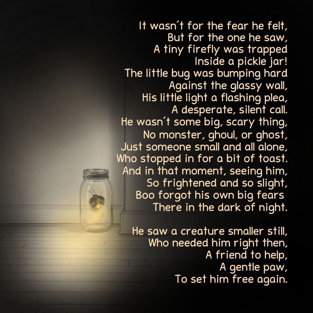 For the first time, Boo feels something stronger than his own fear—the urge to help someone smaller and more scared than himself. Gathering all his courage, he finds a way to set the tiny creature free. Grateful for his kindness, the little firefly decides to return the favor in a magical way.