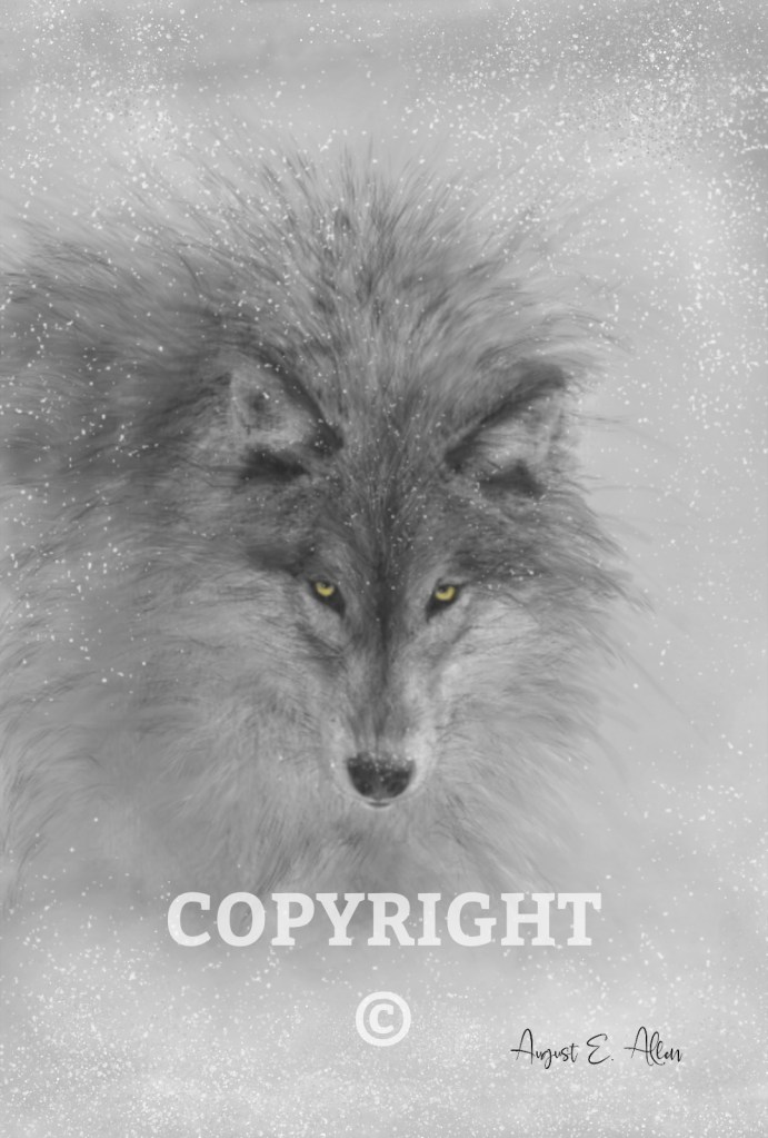Our beautiful gray wolf in snow is called I Am the Storm, and is available in either small (8″×12″) or large (16″×24″).