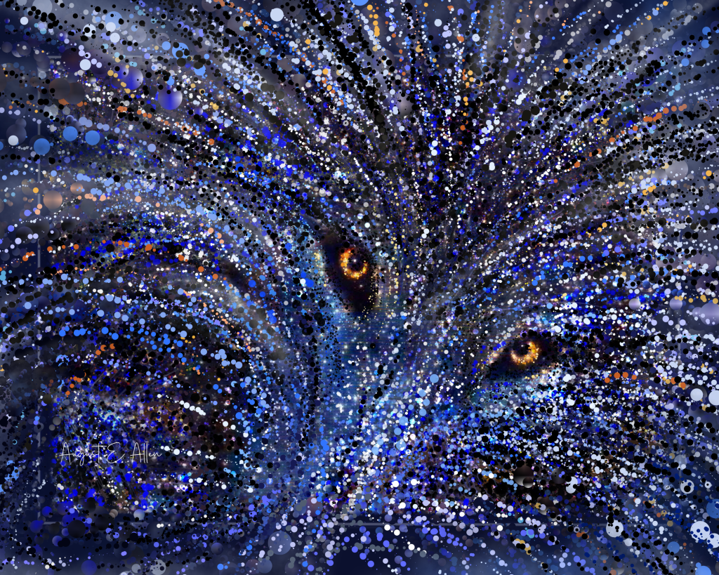 Our celestial wolf is called Keeper of the Night, and is available in either small (12″×12″) or large (20″×20″). The second work offered is available in 8″×10″.